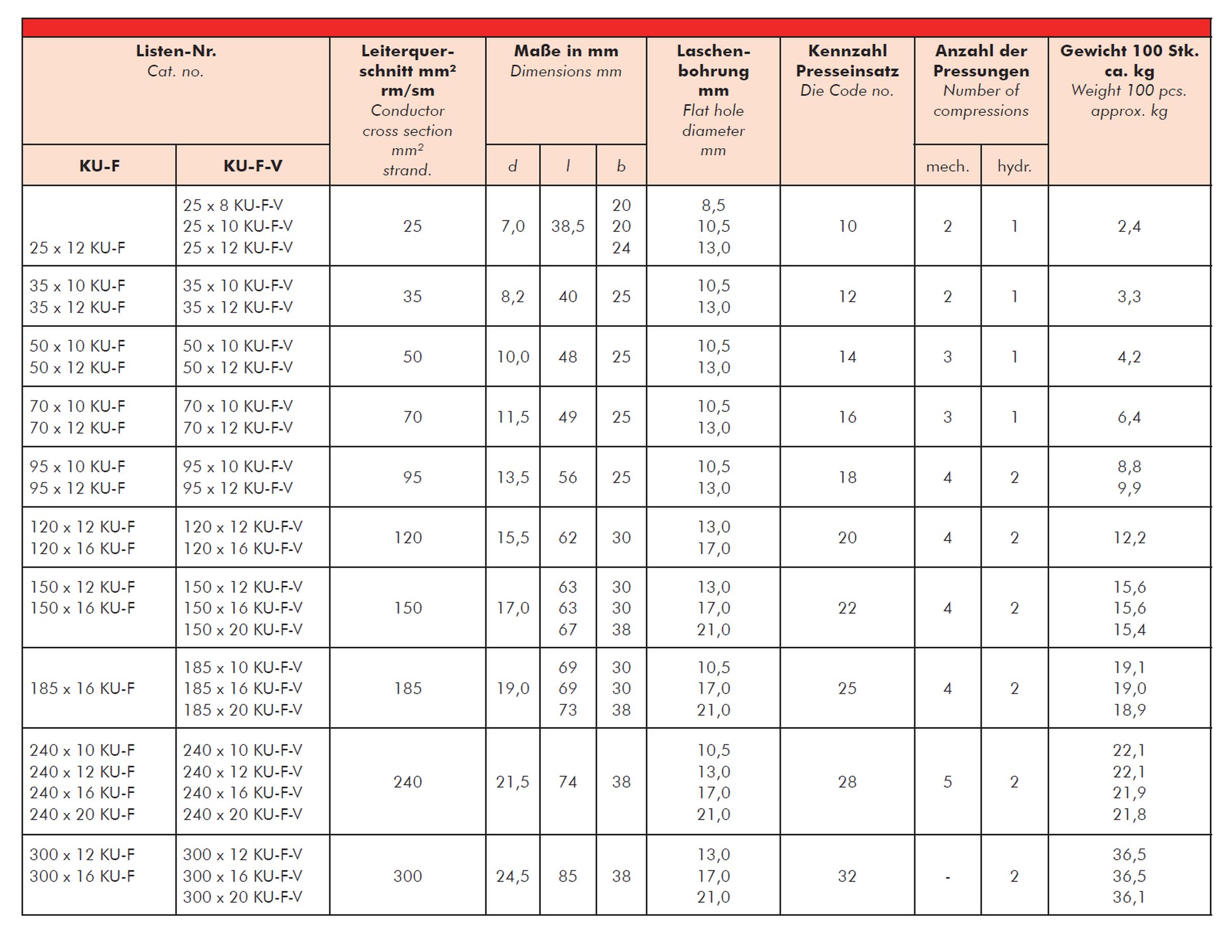 Selection table KU-F / KU-F-V