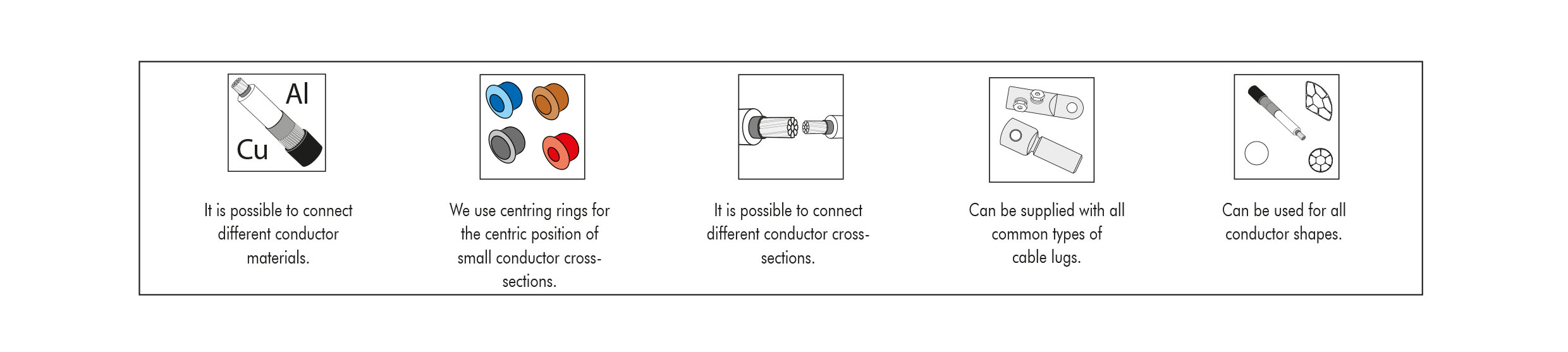 Can be used for copper and aluminium conductors according to EN 60228 classes 1 & 2. For use of our mechanical connectors with class 5 flexible copper conductors, please contact us.