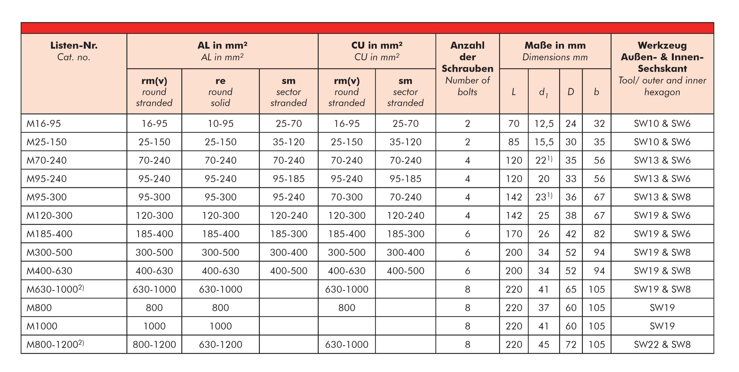 M-Series mechanical connectors are assembled with multiple shear-off-head bolts and are therefore a reliable and economical way of connecting identical or different conductor cross-sections and conductor materials.