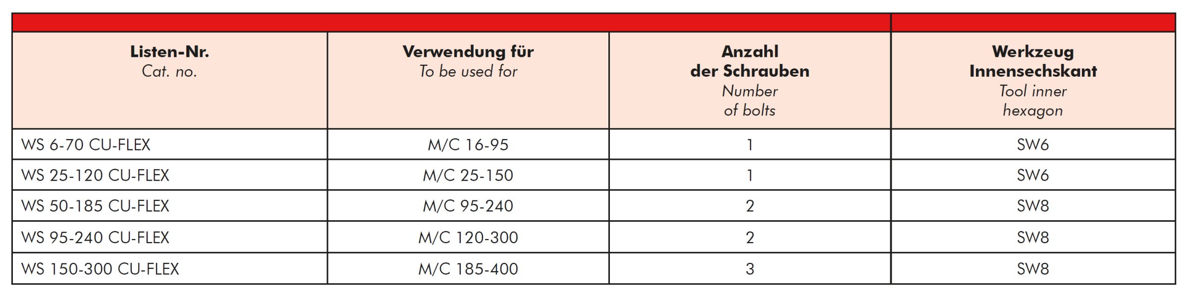For the use of flexible copper conductors (Class 5) with the M/C series, an additional bolt set WS … CU-FLEX has to be used. By using the D series, cross-sections given in the selection table can be clamped with or without contact sleeve. A check on basis of the actual existing conductor dimensions by the user is indispensable. This applies also for the application of Class 6 conductors or other special conductors.