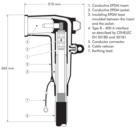 Separable elbow connector (plug-in type) designed to connect polymeric insulated cable to equipment (transformers, switchgear, motors...).