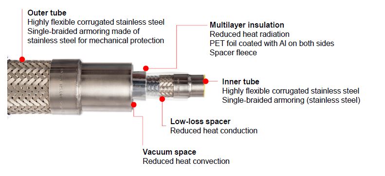 Nexans HIGHFLEX are highly-flexible vacuum insulated transfer lines designed for cryogenic applications with frequent position changes (coupling/decoupling, bending, dynamic stress). Fatigue resistance and pressure stability are improved thanks to stainless steel braids, armoring both the inner and outer tubes. They are applicable to all cryogenic fluids and process temperatures starting from 4K.
